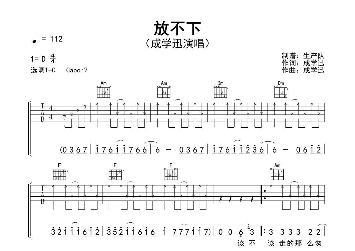《放不下》是成学迅演唱的一首歌曲,精编扫弦版,拍号为4/4拍,歌曲速度为每分钟112拍,歌曲原调为D调,但由于原调指法比较难,为了方便弹奏,本吉他谱采用的是C调指法编配,变调夹2品弹奏即为原调,当然也可以根据自己的音域改变变调夹位置,或者通过改变和弦调性,以方便自己弹奏,这份吉他谱共有三张高清图谱,图谱由 @生产队 编配上传,图谱使用六线谱编配,包含吉他和弦指法、简谱以及歌词部分,使用这份放不下吉他谱,可以让你更加方便地掌握这首歌曲的弹唱技巧,快来尝试吧。成学迅作词、作曲并演唱的歌曲《放不下》原版吉他谱,含前奏、间奏solo编配,精编完美版,值得推荐。