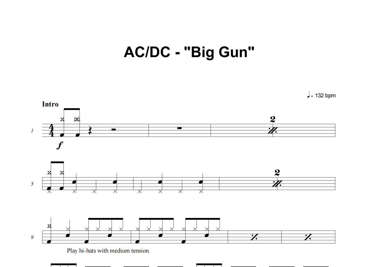 《Big Gun》是AC_DC演唱的一首歌曲,这份架子鼓谱共有五张高清图谱,图谱由 @积极处世 编配上传,图谱使用五线谱编配,使用这份Big Gun架子鼓谱,你将能够轻松地敲打出这首AC_DC的Big Gun,快来尝试吧。