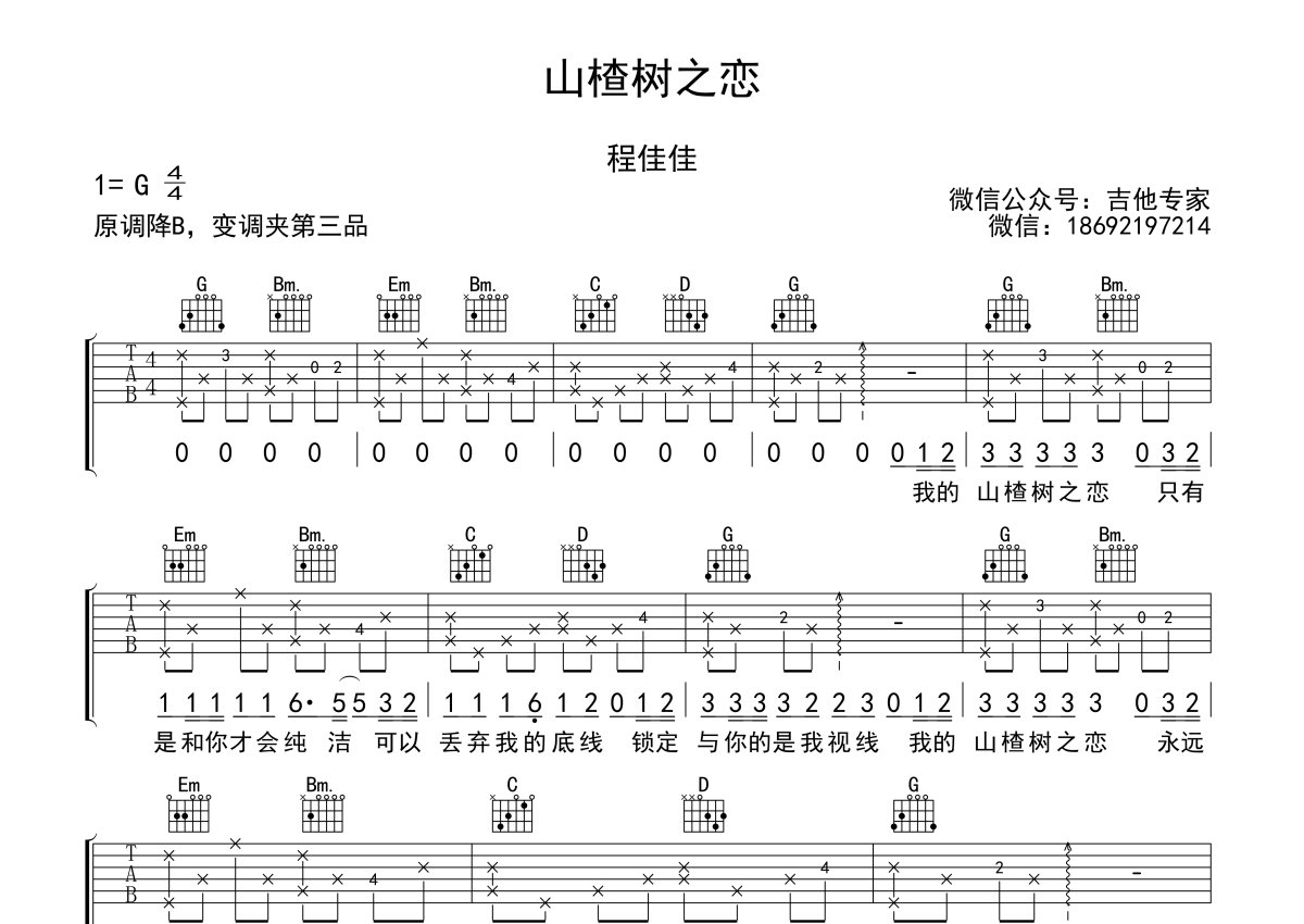 《山楂树之恋》是程佳佳演唱的一首歌曲,本吉他谱采用的是G调指法编配,这份吉他谱共有三张高清图谱,图谱由 @吉他专家 编配上传,图谱使用六线谱编配,包含吉他和弦指法、简谱以及歌词部分,使用这份山楂树之恋吉他谱,可以让你更加方便地掌握这首歌曲的弹唱技巧,快来尝试吧。原调降B,变调夹夹第三品,选用G调指法。张艺谋电影《山楂树之恋》三哥静秋的故事感动了无数人,这首歌其实把前奏弹完了,后面都是一样了,如果觉得一个人不太好弹唱,也可以改简单,只弹和弦伴奏就可以啦。