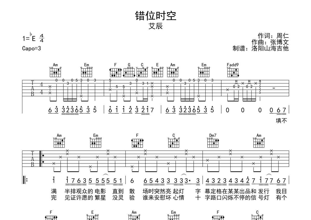 艾辰《错位时空》吉他谱 - C调弹唱六线谱