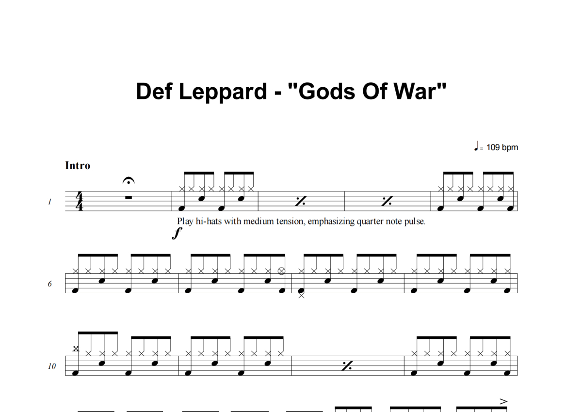 《Gods Of War》是Def Leppard演唱的一首歌曲,这份架子鼓谱共有五张高清图谱,图谱由 @积极处世 编配上传,图谱使用五线谱编配,使用这份Gods Of War架子鼓谱,你将能够轻松地敲打出这首Def Leppard的Gods Of War,快来尝试吧。