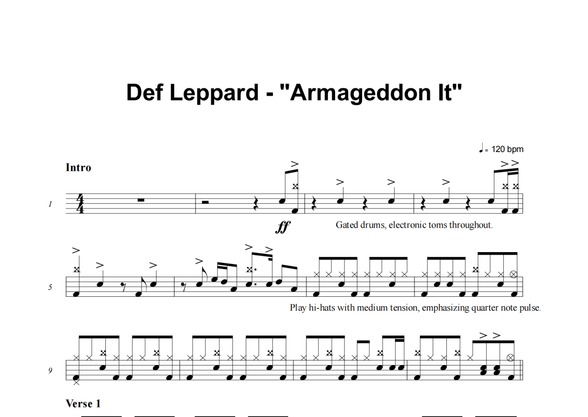 《Armageddon It》是Def Leppard演唱的一首歌曲,这份架子鼓谱共有五张高清图谱,图谱由 @积极处世 编配上传,图谱使用五线谱编配,使用这份Armageddon It架子鼓谱,你将能够轻松地敲打出这首Def Leppard的Armageddon It,快来尝试吧。