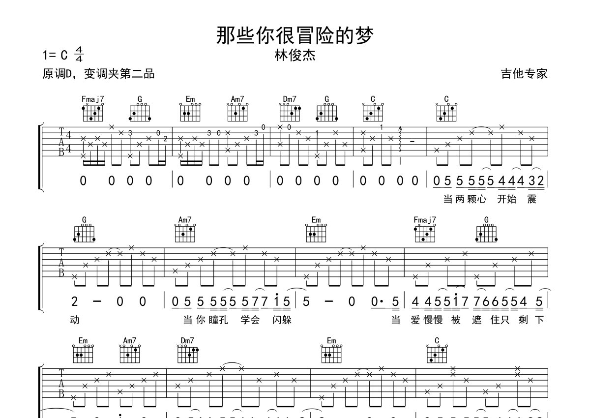 林俊杰《那些你很冒险的梦》吉他谱 - C调弹唱六线谱