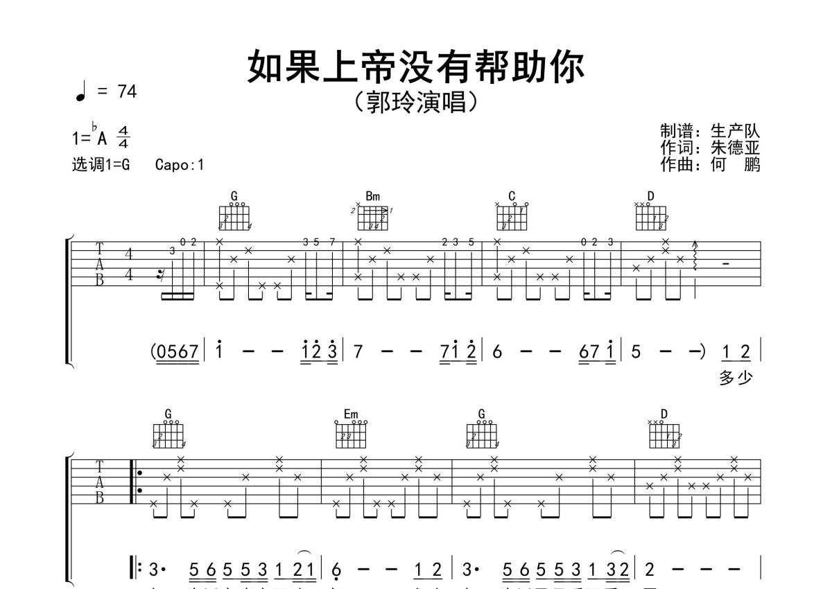 《如果上帝没有帮助你》是郭玲演唱的一首歌曲,精编完美版,拍号为4/4拍,歌曲速度为每分钟74拍,歌曲原调为Ab调,但由于原调指法比较难,为了方便弹奏,本吉他谱采用的是G调指法编配,变调夹1品弹奏即为原调,当然也可以根据自己的音域改变变调夹位置,或者通过改变和弦调性,以方便自己弹奏,这份吉他谱共有三张高清图谱,图谱由 @生产队 编配上传,图谱使用六线谱编配,包含吉他和弦指法、简谱以及歌词部分,使用这份如果上帝没有帮助你吉他谱,可以让你更加方便地掌握这首歌曲的弹唱技巧,快来尝试吧。郭玲演唱的歌曲《如果上帝没有帮助你》原版吉他谱,含前奏、间奏、尾奏solo编配,精编完美版,值得推荐!。