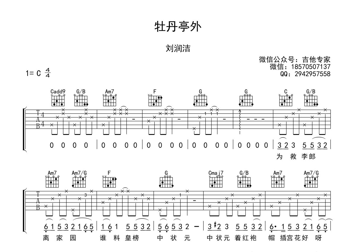 《牡丹亭外》是刘润洁演唱的一首歌曲,本吉他谱采用的是C调指法编配,这份吉他谱共有两张高清图谱,图谱由 @吉他专家 编配上传,图谱使用六线谱编配,包含吉他和弦指法、简谱以及歌词部分,使用这份牡丹亭外吉他谱,可以让你更加方便地掌握这首歌曲的弹唱技巧,快来尝试吧。刘润洁翻唱自陈升的《牡丹亭外》,原调#C,选用C调,变调夹第一品,发现刘润洁的版本最好弹,大家在弹唱的时候,可以根据自己的嗓音来选择合适的调!很有故事的一首歌曲,但是不好唱!个人最喜欢任柏儒的版本。