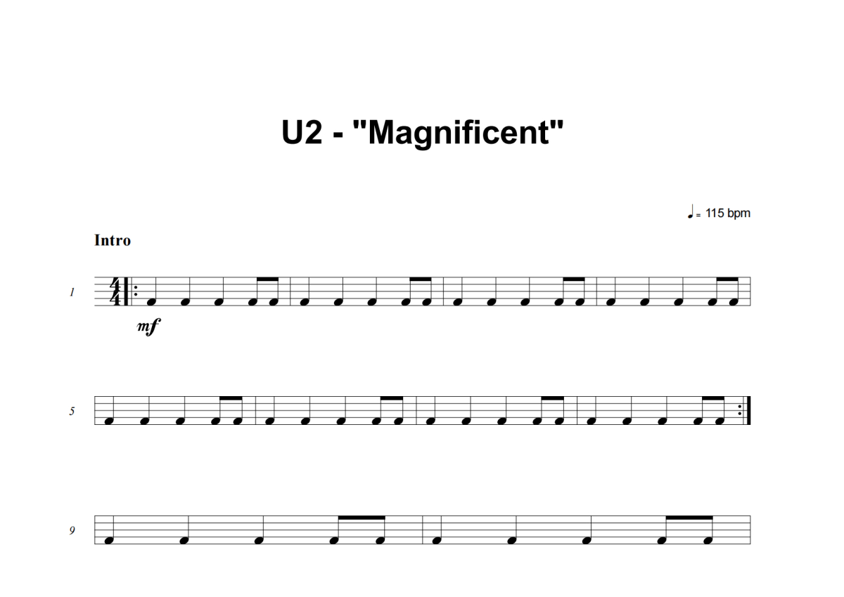 《Magnificent》是U2演唱的一首歌曲,这份架子鼓谱共有五张高清图谱,图谱由 @积极处世 编配上传,图谱使用五线谱编配,使用这份Magnificent架子鼓谱,你将能够轻松地敲打出这首U2的Magnificent,快来尝试吧。