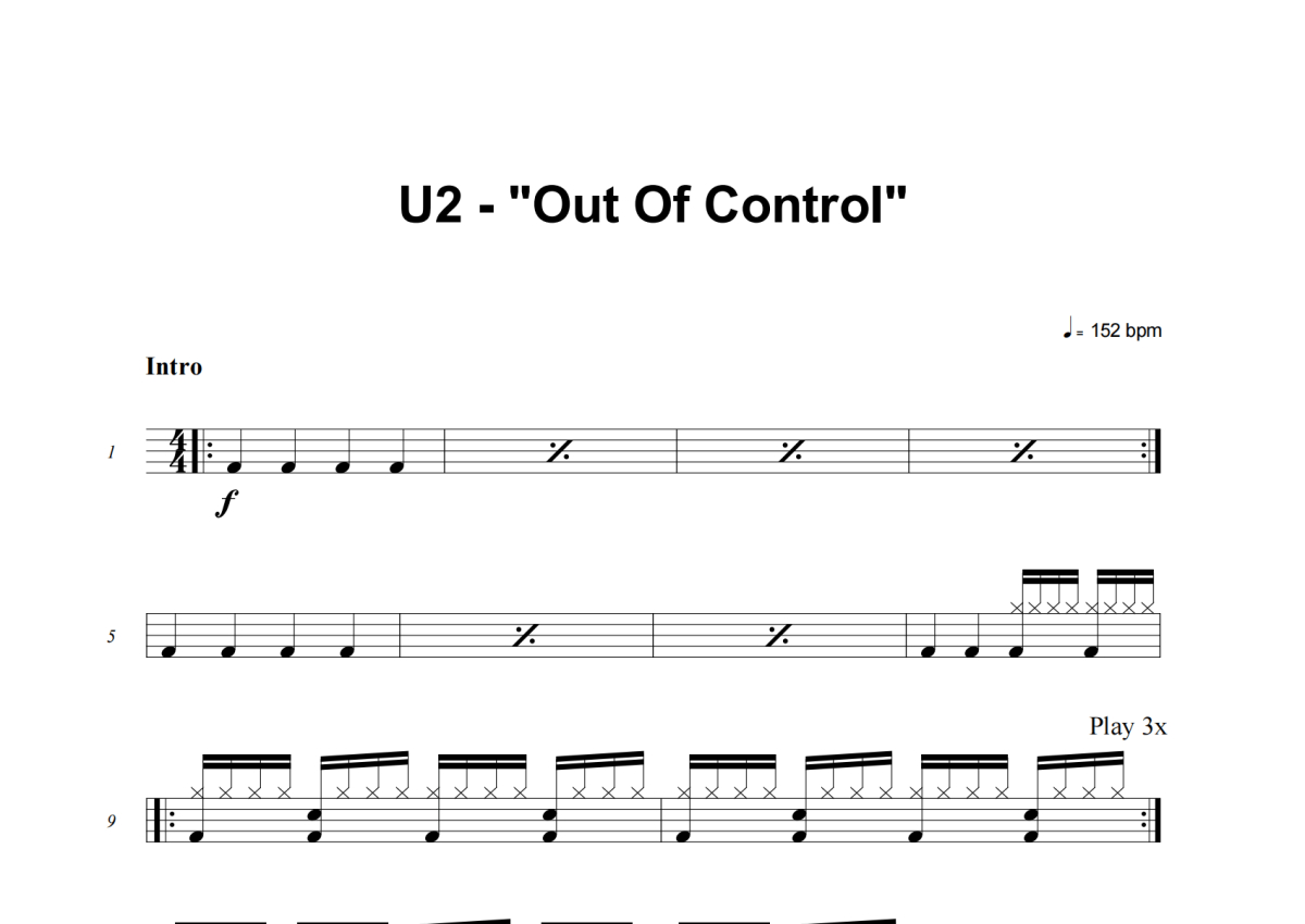 《Out Of Control》是U2演唱的一首歌曲,这份架子鼓谱共有五张高清图谱,图谱由 @积极处世 编配上传,图谱使用五线谱编配,使用这份Out Of Control架子鼓谱,你将能够轻松地敲打出这首U2的Out Of Control,快来尝试吧。