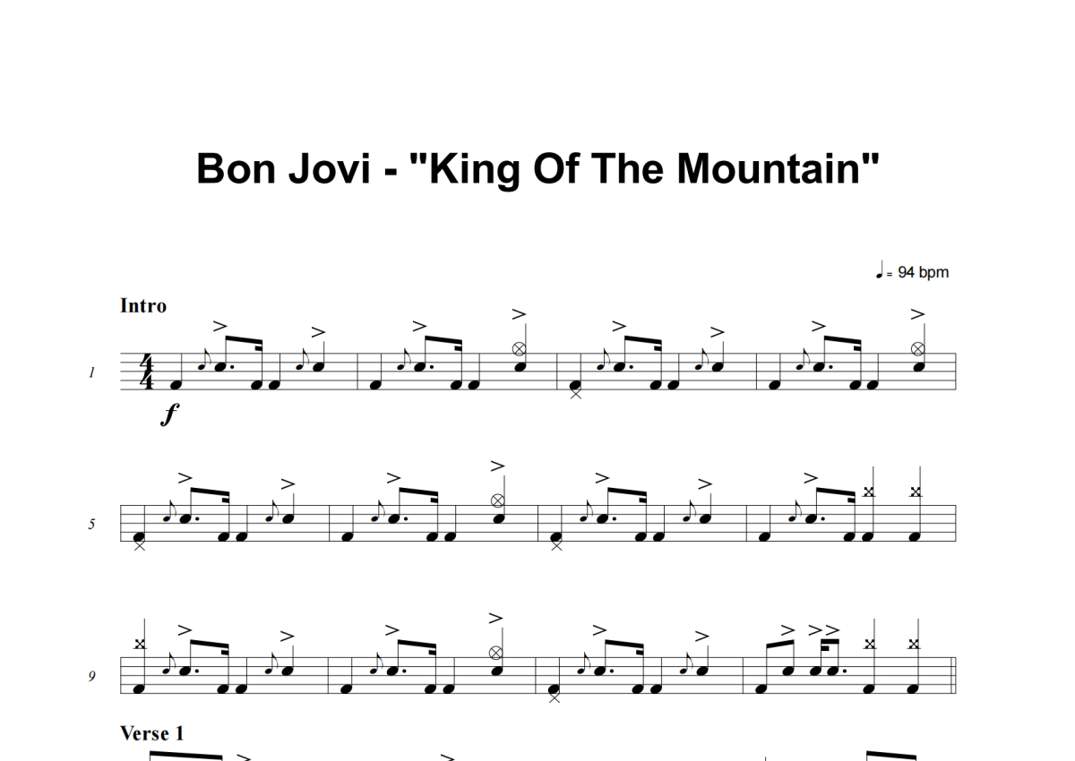 《King Of The Mountain》是Bon Jovi演唱的一首歌曲,这份架子鼓谱共有五张高清图谱,图谱由 @积极处世 编配上传,图谱使用五线谱编配,使用这份King Of The Mountain架子鼓谱,你将能够轻松地敲打出这首Bon Jovi的King Of The Mountain,快来尝试吧。