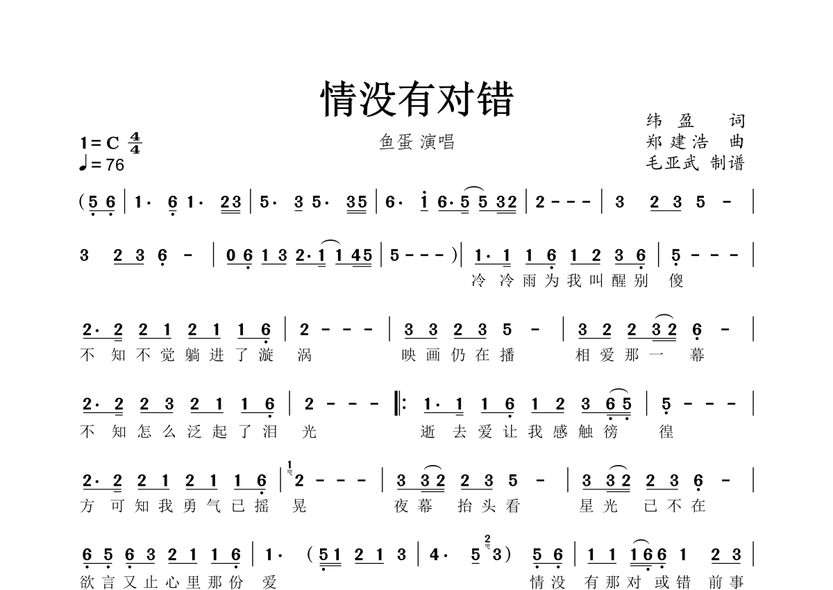 《情没有对错》是鱼蛋演唱的一首歌曲,这份简谱共有一张高清图谱,图谱由 @秋天的童话 编配上传。