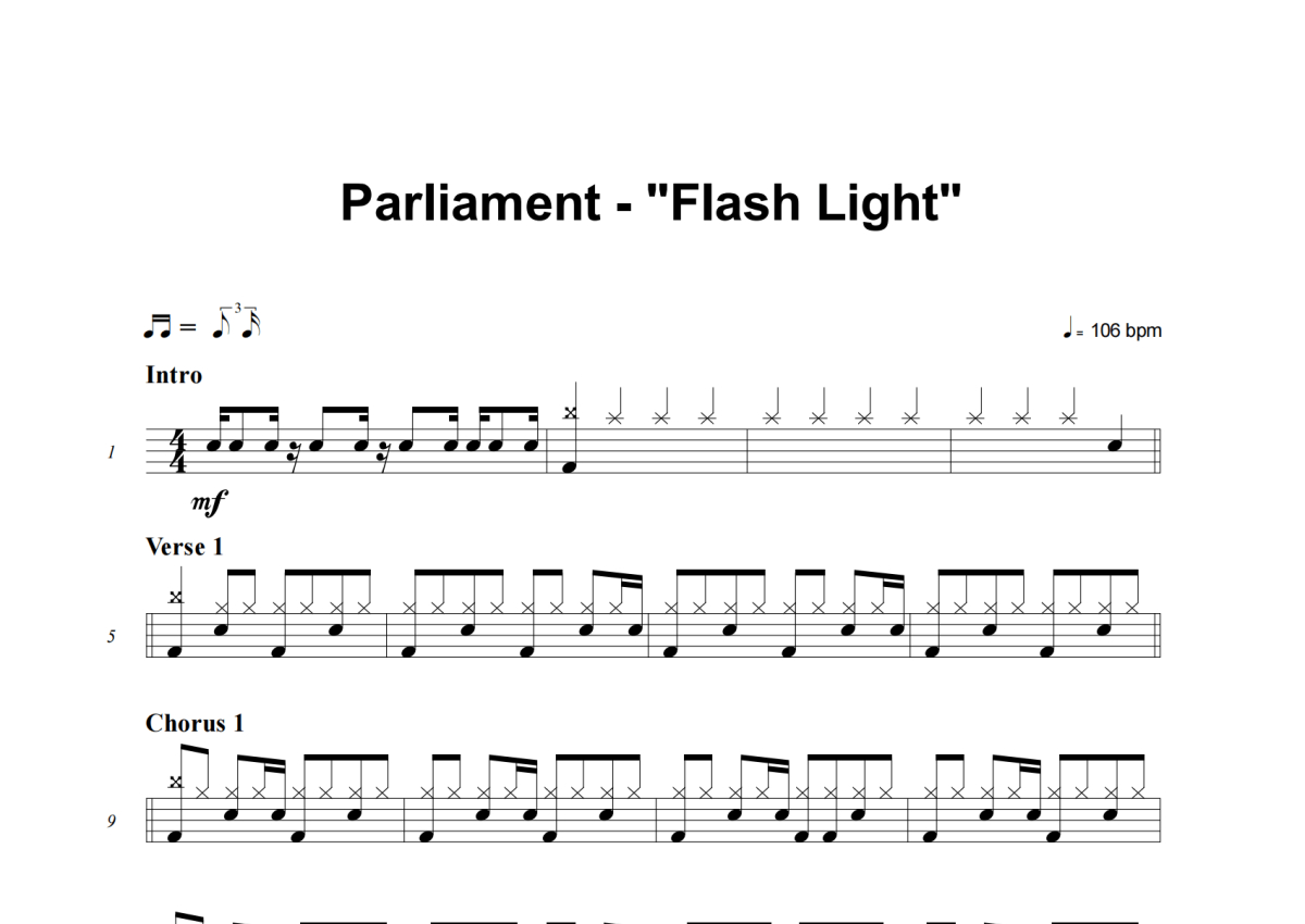 《Flash Light》是Parliament演唱的一首歌曲,这份架子鼓谱共有五张高清图谱,图谱由 @积极处世 编配上传,图谱使用五线谱编配,使用这份Flash Light架子鼓谱,你将能够轻松地敲打出这首Parliament的Flash Light,快来尝试吧。