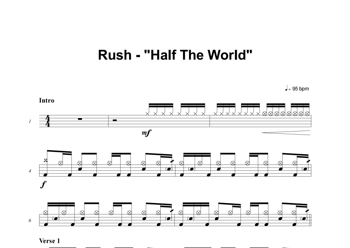 《Half The World》是Rush演唱的一首歌曲,这份架子鼓谱共有五张高清图谱,图谱由 @积极处世 编配上传,图谱使用五线谱编配,使用这份Half The World架子鼓谱,你将能够轻松地敲打出这首Rush的Half The World,快来尝试吧。