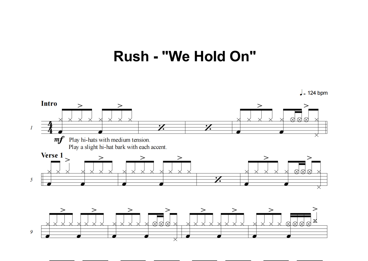 《We Hold On》是Rush演唱的一首歌曲,这份架子鼓谱共有五张高清图谱,图谱由 @积极处世 编配上传,图谱使用五线谱编配,使用这份We Hold On架子鼓谱,你将能够轻松地敲打出这首Rush的We Hold On,快来尝试吧。