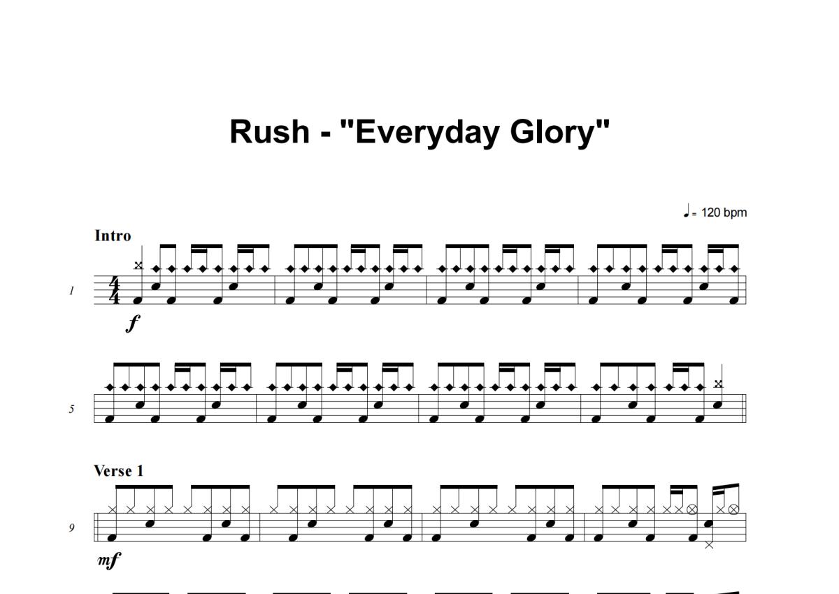 《Everyday Glory》是Rush演唱的一首歌曲,这份架子鼓谱共有五张高清图谱,图谱由 @积极处世 编配上传,图谱使用五线谱编配,使用这份Everyday Glory架子鼓谱,你将能够轻松地敲打出这首Rush的Everyday Glory,快来尝试吧。