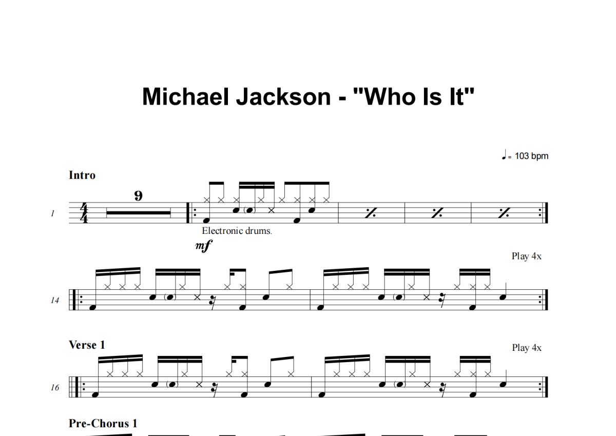 《Who Is It》是Michael Jackson演唱的一首歌曲,这份架子鼓谱共有四张高清图谱,图谱由 @积极处世 编配上传,图谱使用五线谱编配,使用这份Who Is It架子鼓谱,你将能够轻松地敲打出这首Michael Jackson的Who Is It,快来尝试吧。