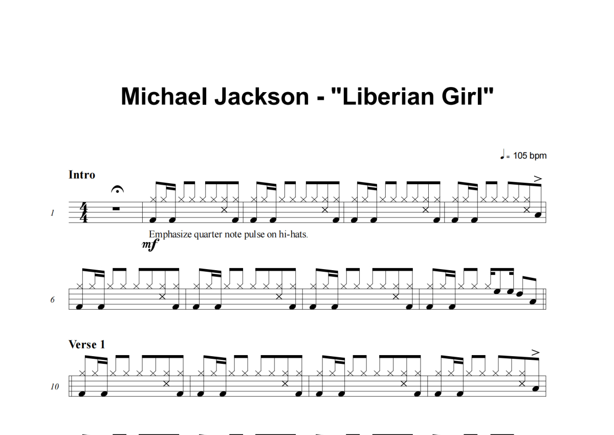 《Liberian Girl》是Michael Jackson演唱的一首歌曲,这份架子鼓谱共有三张高清图谱,图谱由 @积极处世 编配上传,图谱使用五线谱编配,使用这份Liberian Girl架子鼓谱,你将能够轻松地敲打出这首Michael Jackson的Liberian Girl,快来尝试吧。