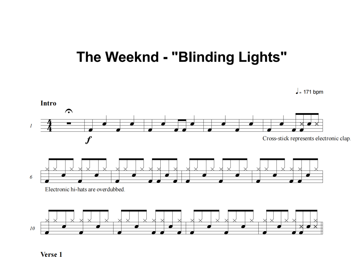 《Blinding Lights》是The Weeknd演唱的一首歌曲,这份架子鼓谱共有四张高清图谱,图谱由 @积极处世 编配上传,图谱使用五线谱编配,使用这份Blinding Lights架子鼓谱,你将能够轻松地敲打出这首The Weeknd的Blinding Lights,快来尝试吧。