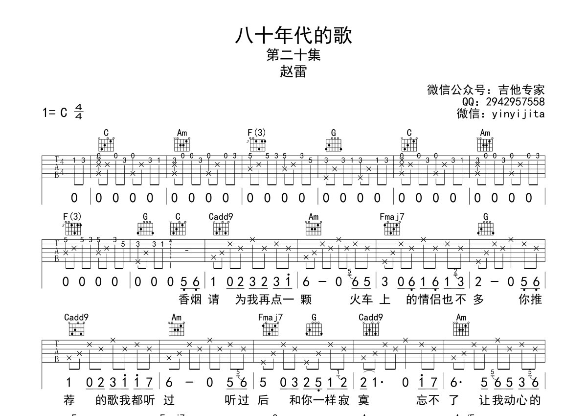 赵雷《八十年代的歌》吉他谱 - C调弹唱六线谱