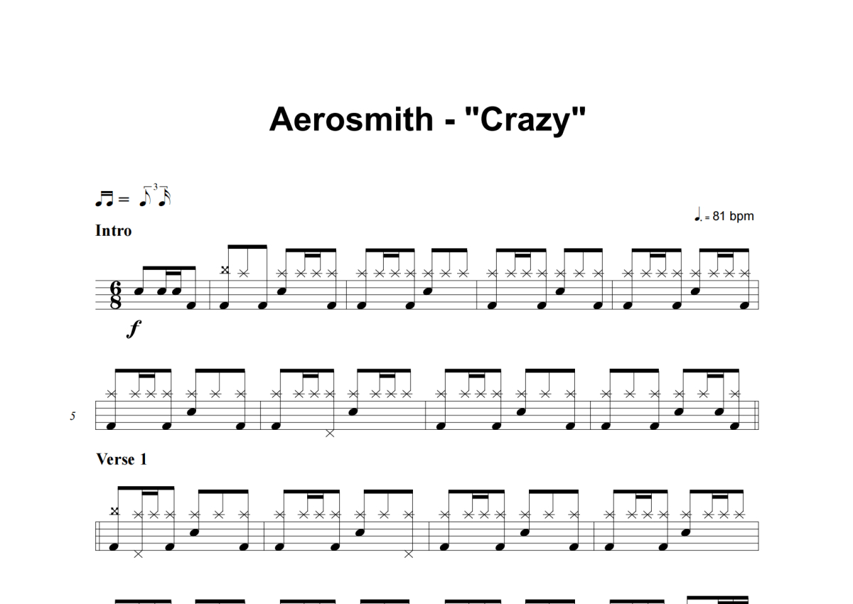 《Crazy》是Aerosmith演唱的一首歌曲,这份架子鼓谱共有五张高清图谱,图谱由 @积极处世 编配上传,图谱使用五线谱编配,使用这份Crazy架子鼓谱,你将能够轻松地敲打出这首Aerosmith的Crazy,快来尝试吧。