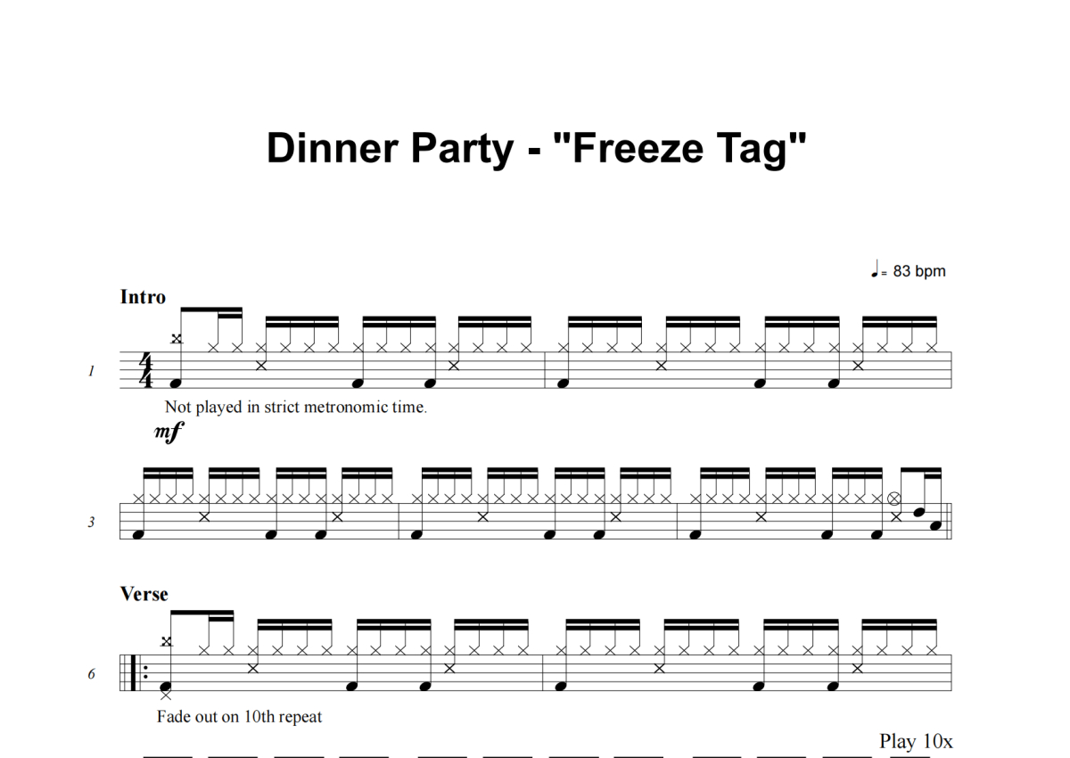 《Freeze Tag》是Dinner Party演唱的一首歌曲,这份架子鼓谱共有一张高清图谱,图谱由 @积极处世 编配上传,图谱使用五线谱编配,使用这份Freeze Tag架子鼓谱,你将能够轻松地敲打出这首Dinner Party的Freeze Tag,快来尝试吧。