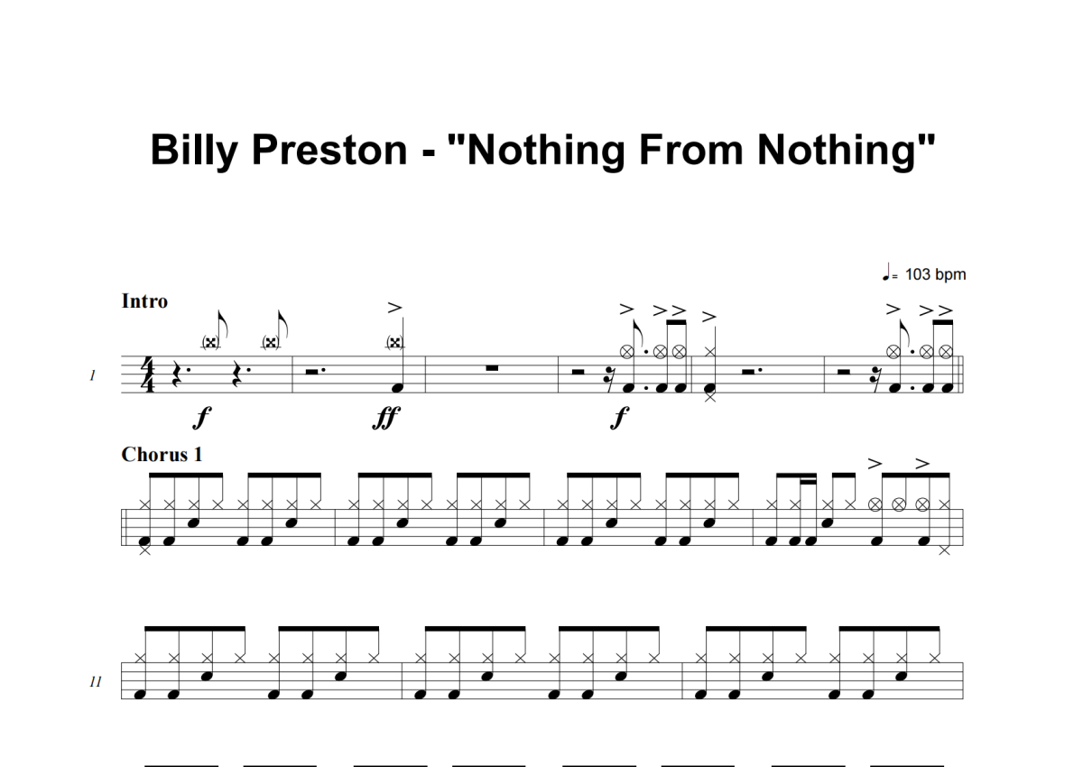 《Nothing From Nothing》是Billy Preston演唱的一首歌曲,这份架子鼓谱共有三张高清图谱,图谱由 @积极处世 编配上传,图谱使用五线谱编配,使用这份Nothing From Nothing架子鼓谱,你将能够轻松地敲打出这首Billy Preston的Nothing From Nothing,快来尝试吧。