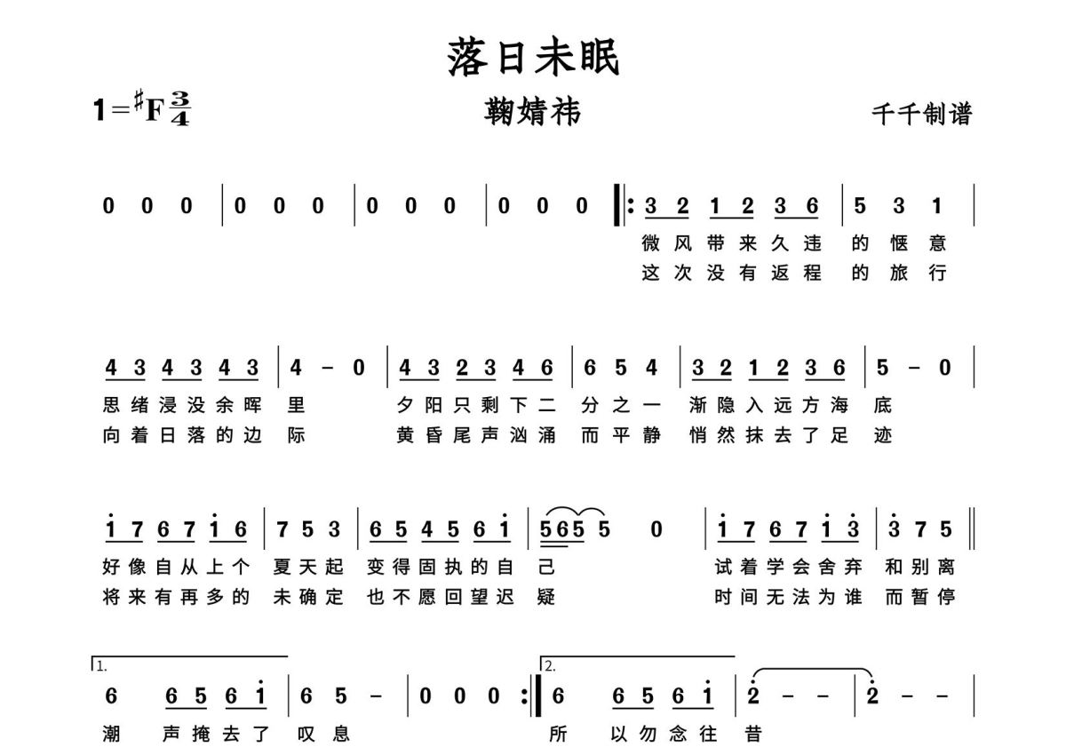 《落日未眠》是鞠婧祎演唱的一首歌曲,这份简谱共有两张高清图谱,图谱由 @千千 编配上传。