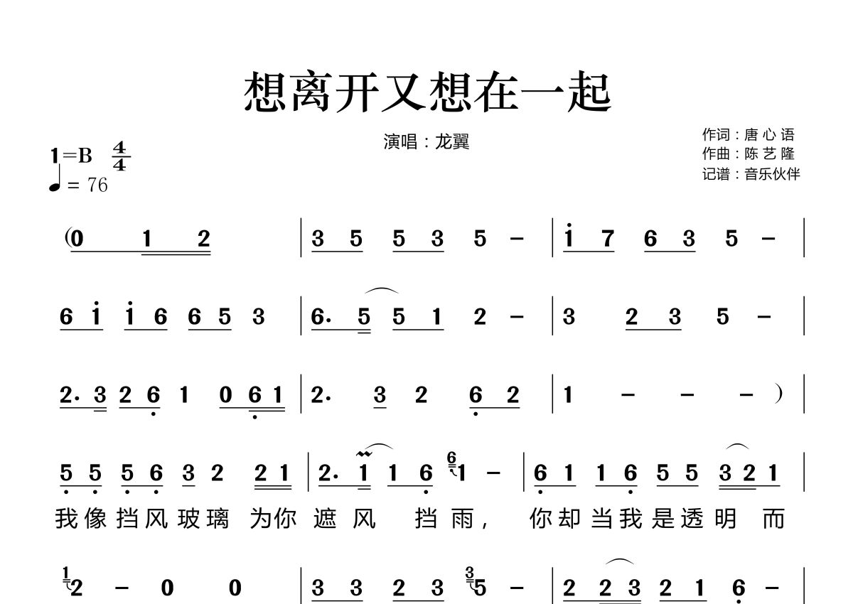《想离开又想在一起》是龙翼演唱的一首歌曲,拍号为4/4拍,歌曲速度为每分钟76拍,这份简谱共有两张高清图谱,图谱由 @音乐伙伴 编配上传。
