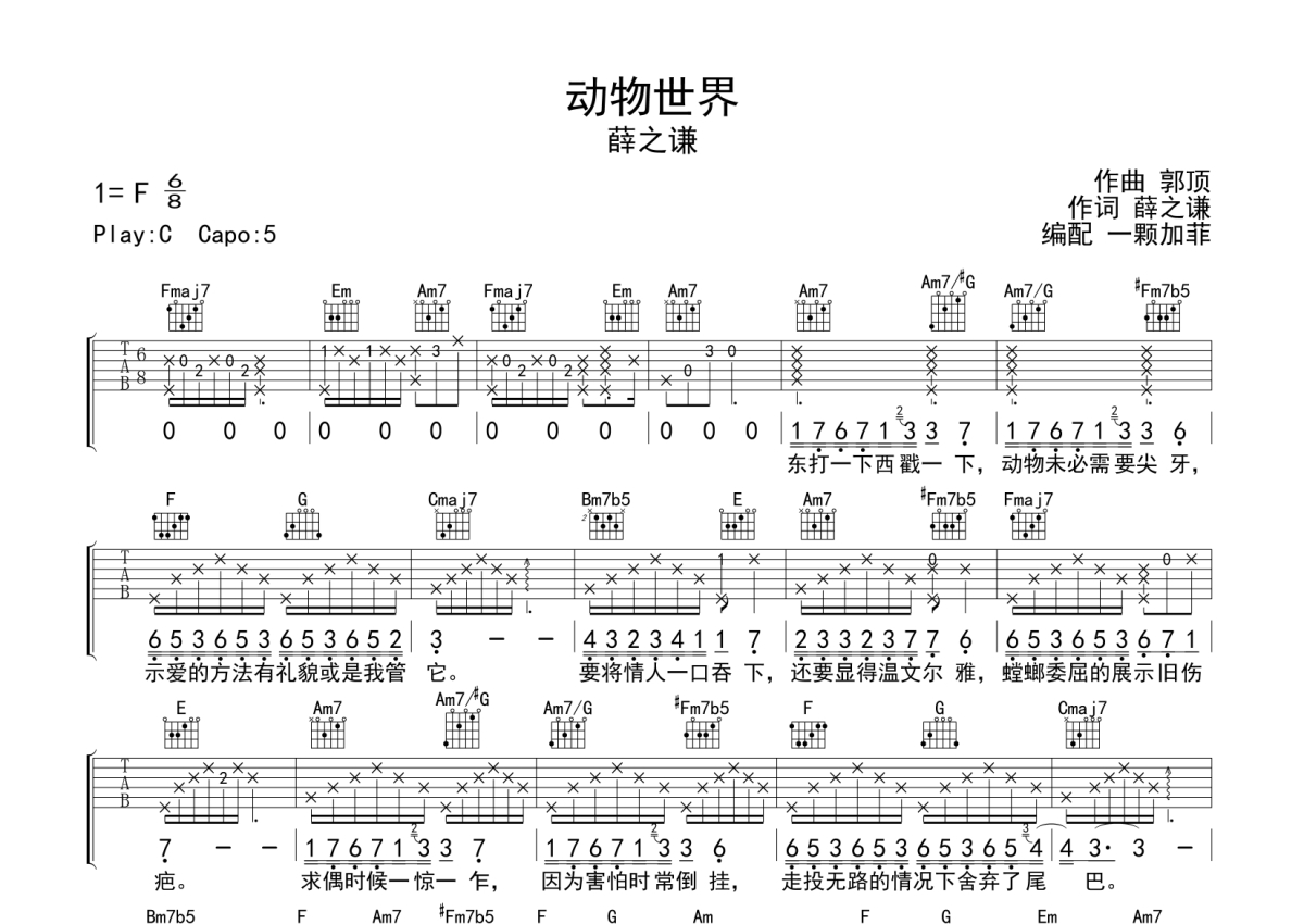 《动物世界》是薛之谦演唱的一首歌曲,本吉他谱采用的是C调指法编配,这份吉他谱共有两张高清图谱,图谱由 @一颗加菲 编配上传,图谱使用六线谱编配,包含吉他和弦指法、简谱以及歌词部分,曲谱配备了相关的音频提供试听,使用这份动物世界吉他谱,可以让你更加方便地掌握这首歌曲的弹唱技巧,快来尝试吧。