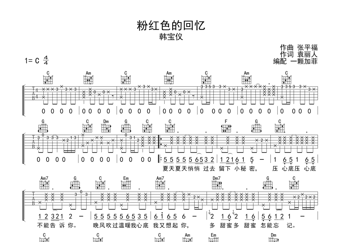 韩宝仪《粉红色的回忆》吉他谱 - C调弹唱六线谱