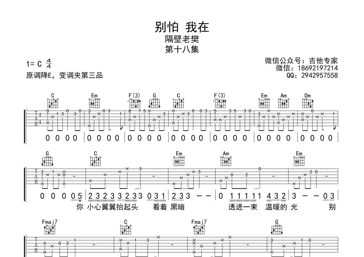 《别怕我在》是隔壁老樊演唱的一首歌曲,本吉他谱采用的是C调指法编配,这份吉他谱共有两张高清图谱,图谱由 @吉他专家 编配上传,图谱使用六线谱编配,包含吉他和弦指法、简谱以及歌词部分,使用这份别怕我在吉他谱,可以让你更加方便地掌握这首歌曲的弹唱技巧,快来尝试吧。歌曲原调为降E调,这里采用了C调指法根据原版进行编配,演唱时夹变调夹3品回到原调。这首歌编配难度不大,和弦还算比较简单,节奏也并不紧凑,只是在演唱时需要能够很好的跟上伴奏。