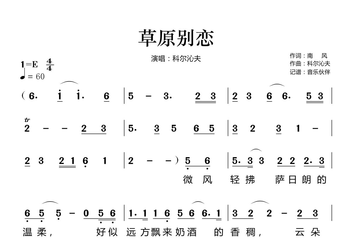 《草原别恋》是科尔沁夫演唱的一首歌曲,拍号为4/4拍,歌曲速度为每分钟60拍,这份简谱共有两张高清图谱,图谱由 @音乐伙伴 编配上传。