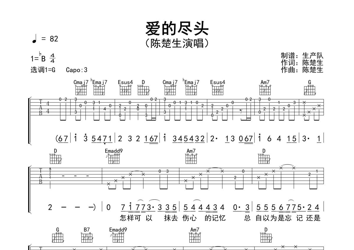 《爱的尽头》是陈楚生演唱的一首歌曲,精编完美版,拍号为4/4拍,歌曲速度为每分钟82拍,歌曲原调为Bb调,但由于原调指法比较难,为了方便弹奏,本吉他谱采用的是G调指法编配,变调夹3品弹奏即为原调,当然也可以根据自己的音域改变变调夹位置,或者通过改变和弦调性,以方便自己弹奏,这份吉他谱共有三张高清图谱,图谱由 @生产队 编配上传,图谱使用六线谱编配,包含吉他和弦指法、简谱以及歌词部分,使用这份爱的尽头吉他谱,可以让你更加方便地掌握这首歌曲的弹唱技巧,快来尝试吧。陈楚生作词、作曲并演唱的歌曲《爱的尽头》原版吉他谱,含前奏、间奏solo编配,精编完美版,值得推荐!。