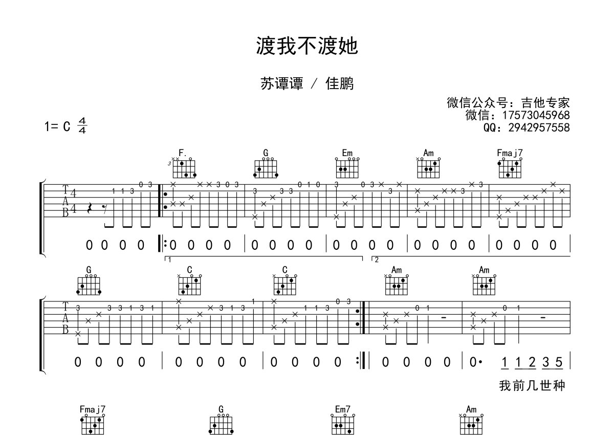 《渡我不渡她》是苏谭谭/佳鹏演唱的一首歌曲,本吉他谱采用的是C调指法编配,这份吉他谱共有两张高清图谱,图谱由 @吉他专家 编配上传,图谱使用六线谱编配,包含吉他和弦指法、简谱以及歌词部分,使用这份渡我不渡她吉他谱,可以让你更加方便地掌握这首歌曲的弹唱技巧,快来尝试吧。苏谭谭/佳鹏《渡我不渡她》吉他谱_C调吉他弹唱谱。