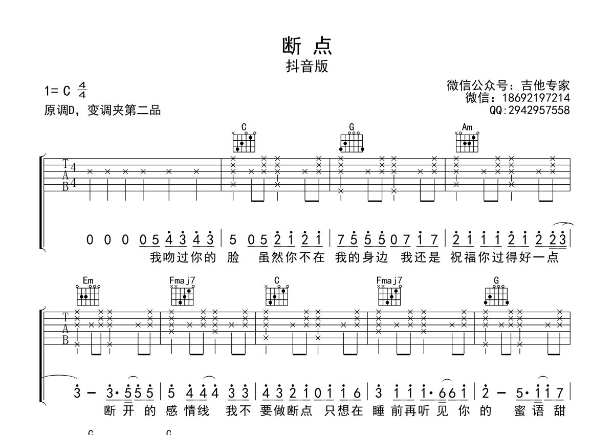 《断点》是张敬轩演唱的一首歌曲,抖音版,本吉他谱采用的是C调指法编配,这份吉他谱共有一张高清图谱,图谱由 @吉他专家 编配上传,图谱使用六线谱编配,包含吉他和弦指法、简谱以及歌词部分,使用这份断点吉他谱,可以让你更加方便地掌握这首歌曲的弹唱技巧,快来尝试吧。张敬轩《断点》吉他谱_C调吉他弹唱谱_抖音版。