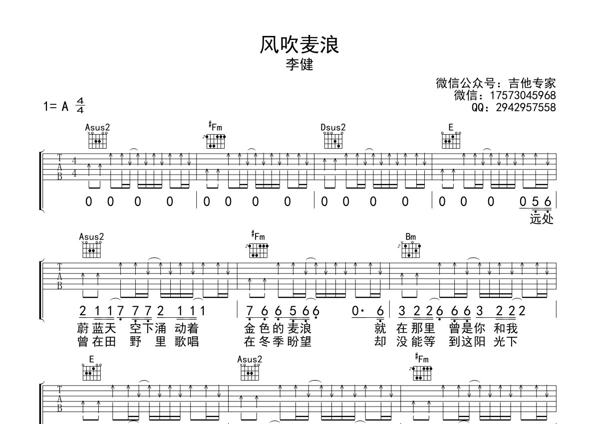 李健《风吹麦浪》吉他谱 - A调弹唱六线谱