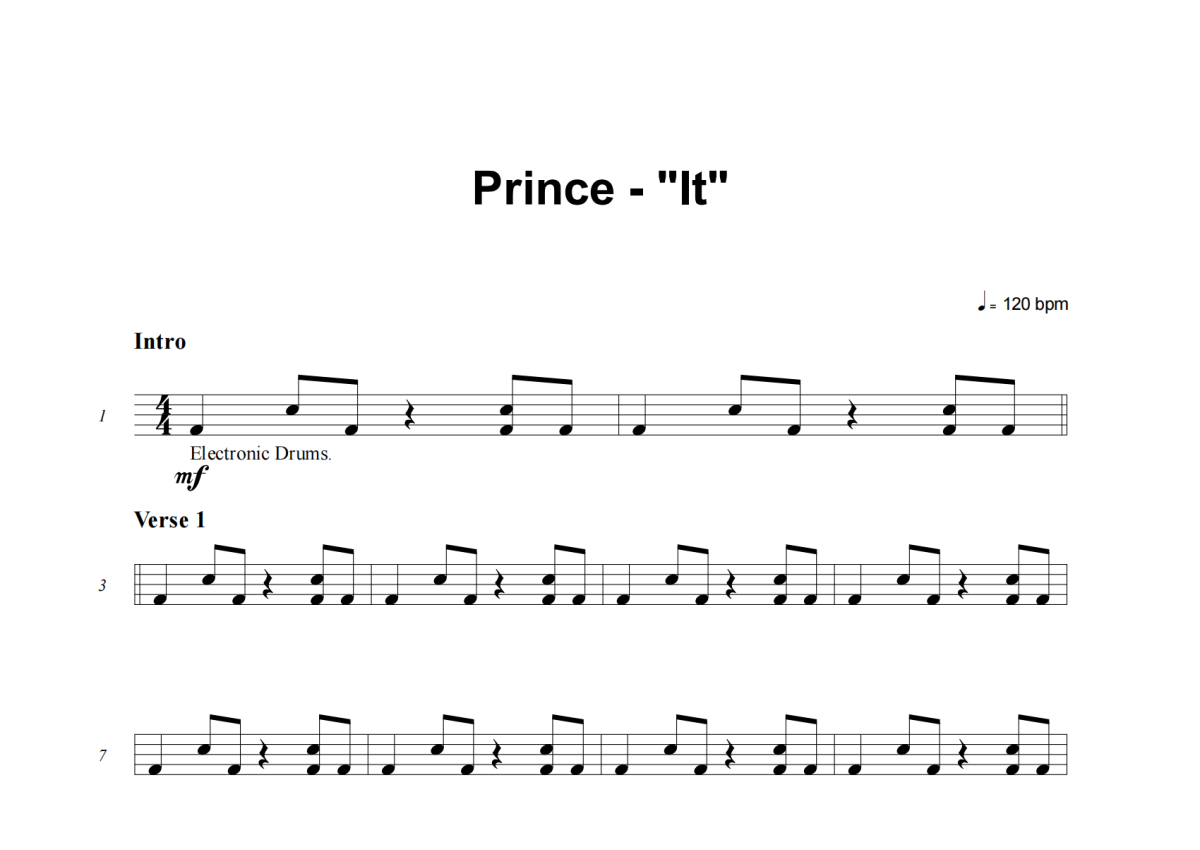 《It》是Prince演唱的一首歌曲,这份架子鼓谱共有五张高清图谱,图谱由 @积极处世 编配上传,图谱使用五线谱编配,使用这份It架子鼓谱,你将能够轻松地敲打出这首Prince的It,快来尝试吧。