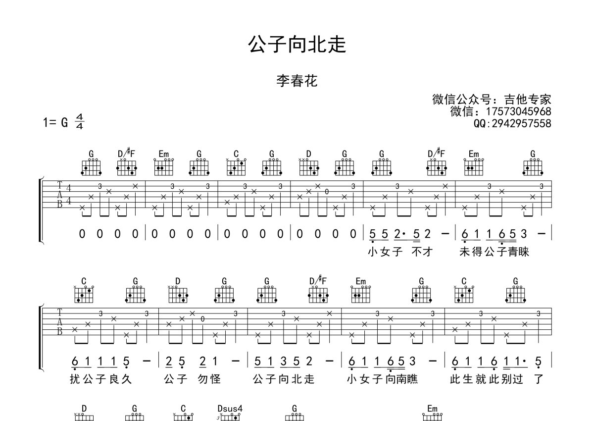 李春花《公子向北走》吉他谱 - G调弹唱六线谱