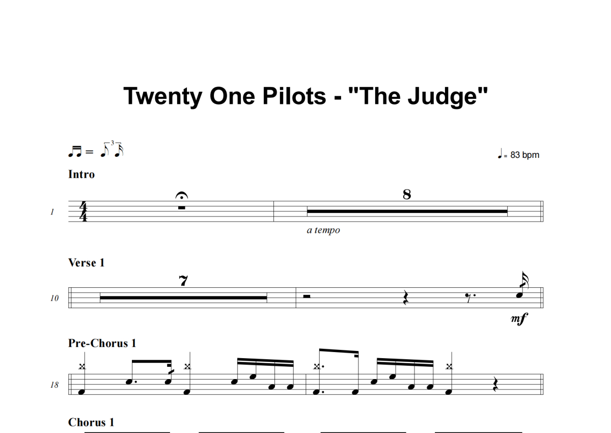 《The Judge》是Twenty One Pilots演唱的一首歌曲,这份架子鼓谱共有四张高清图谱,图谱由 @积极处世 编配上传,图谱使用五线谱编配,使用这份The Judge架子鼓谱,你将能够轻松地敲打出这首Twenty One Pilots的The Judge,快来尝试吧。