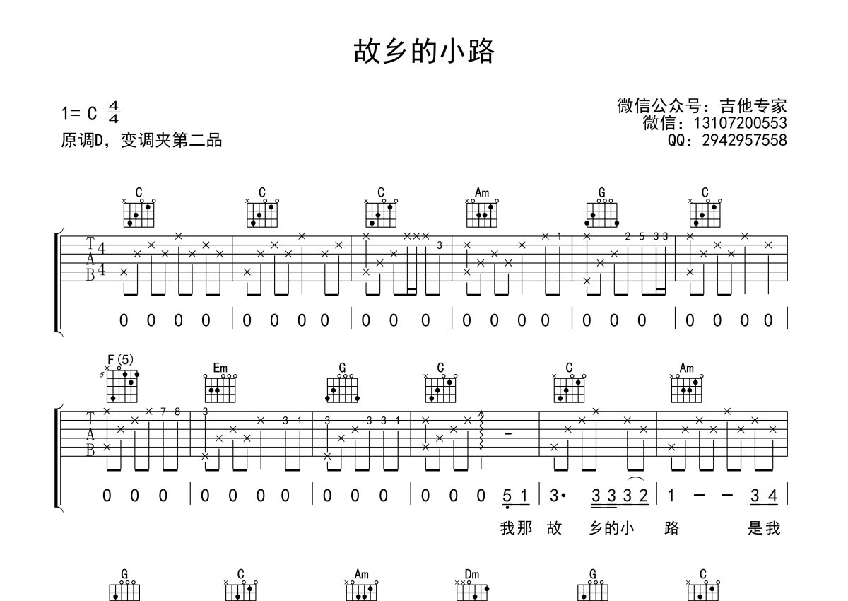 《故乡的小路》,本吉他谱采用的是C调指法编配,这份吉他谱共有一张高清图谱,图谱由 @吉他专家 编配上传,图谱使用六线谱编配,包含吉他和弦指法、简谱以及歌词部分,使用这份故乡的小路吉他谱,可以让你更加方便地掌握这首歌曲的弹唱技巧,快来尝试吧。 我那故乡的小路,是我童年走过的路,路旁盛开的小花,给我欢乐和幸福。故乡的小路,弯曲又迷人,频频出现在我的梦中,那是一个永远也回不去的地方,承载着许多童年美好记忆。 C调入门版,和弦和节奏型都是非常简单的类型,特别适合新手入门朋友。 。