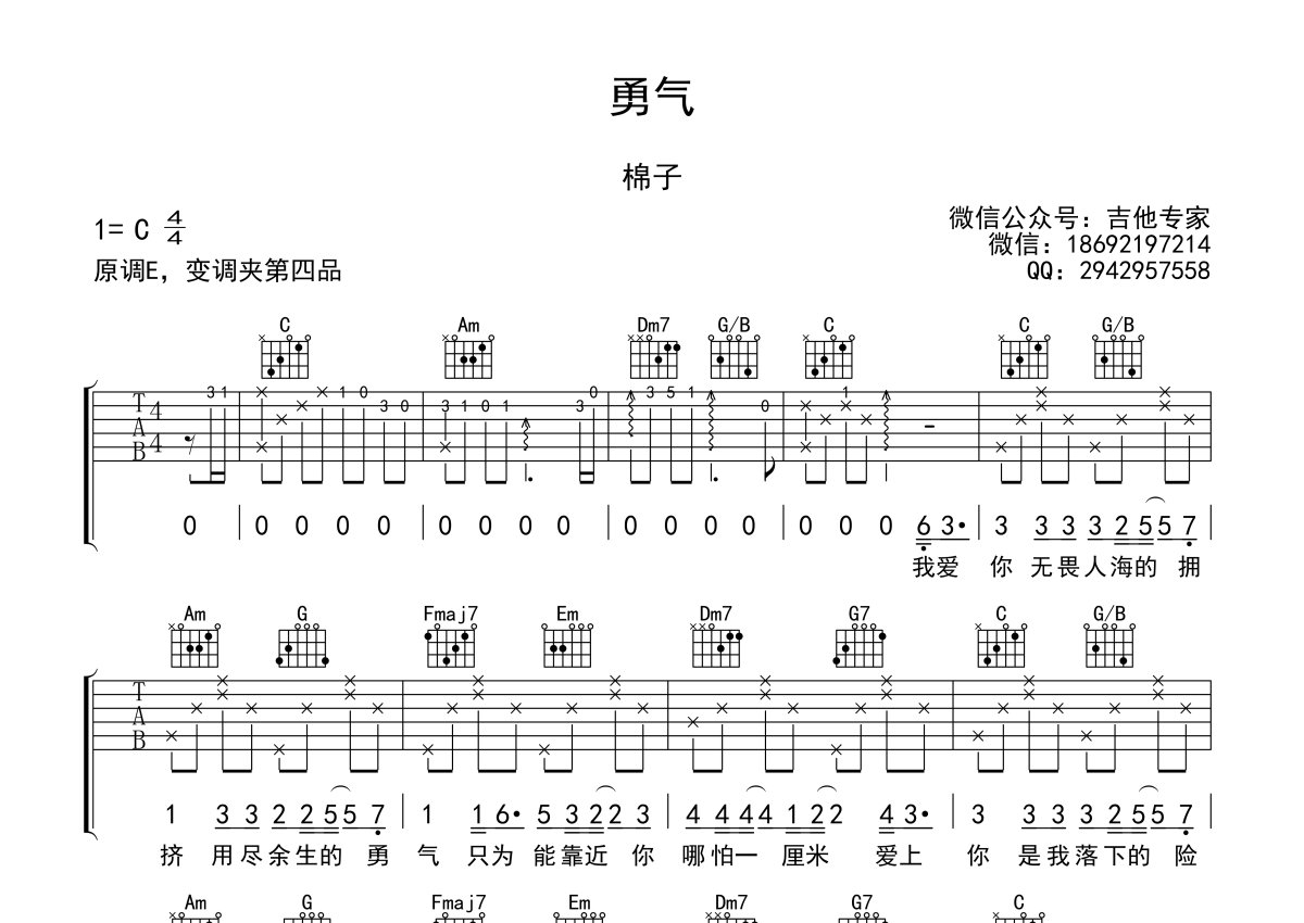 棉子《勇气》吉他谱 - C调弹唱六线谱