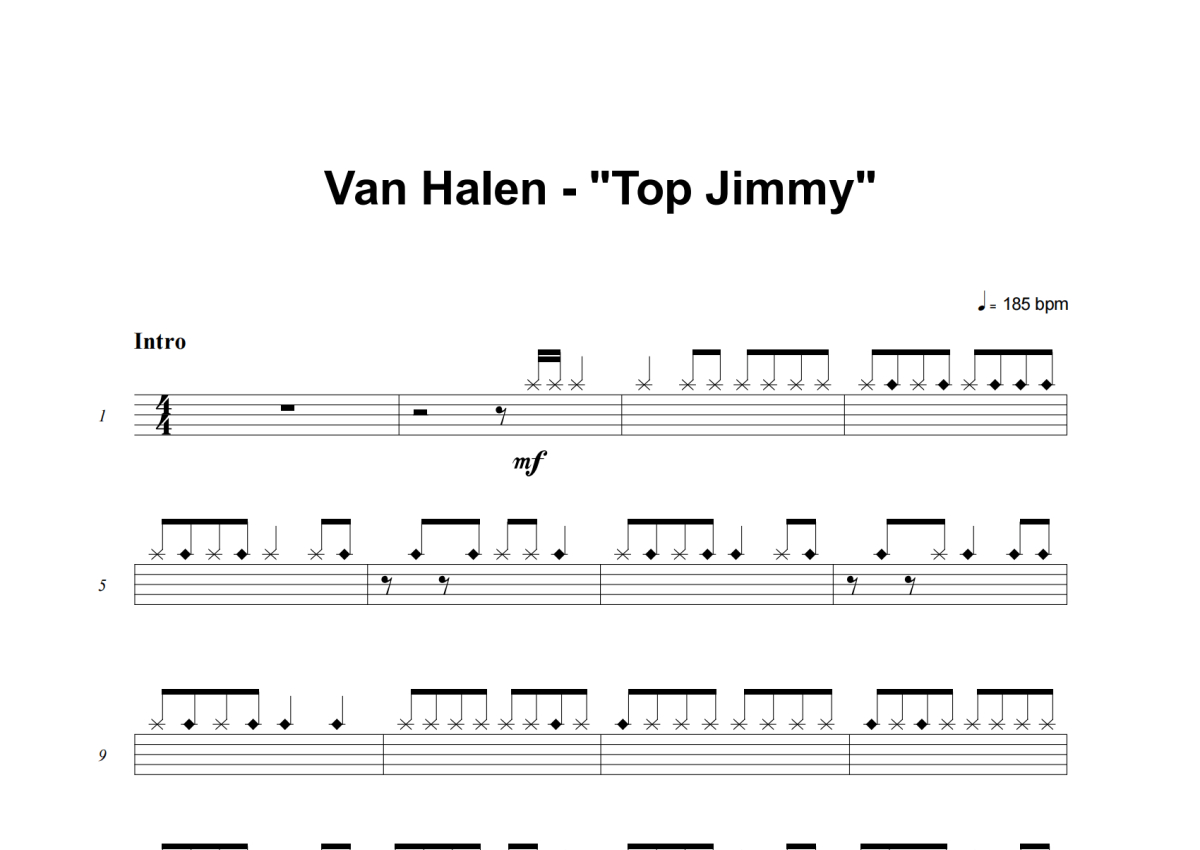 《Top Jimmy》是Van Halen演唱的一首歌曲,这份架子鼓谱共有四张高清图谱,图谱由 @积极处世 编配上传,图谱使用五线谱编配,使用这份Top Jimmy架子鼓谱,你将能够轻松地敲打出这首Van Halen的Top Jimmy,快来尝试吧。