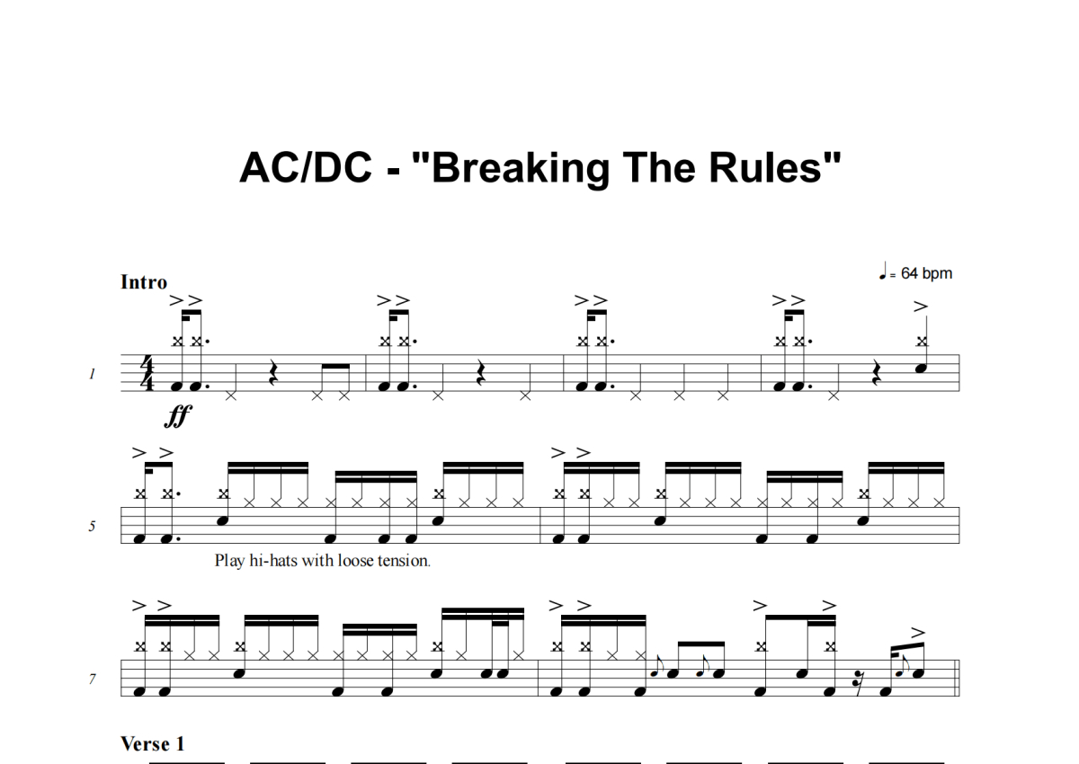 《Breaking The Rules》是AC_DC演唱的一首歌曲,这份架子鼓谱共有五张高清图谱,图谱由 @积极处世 编配上传,图谱使用五线谱编配,使用这份Breaking The Rules架子鼓谱,你将能够轻松地敲打出这首AC_DC的Breaking The Rules,快来尝试吧。