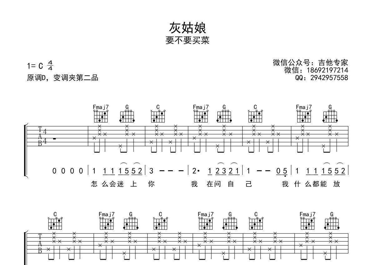 要不要买菜《灰姑娘》吉他谱 - C调弹唱六线谱 - 抖音片段