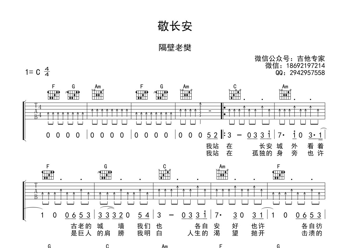 隔壁老樊《敬长安》吉他谱 - C调弹唱六线谱