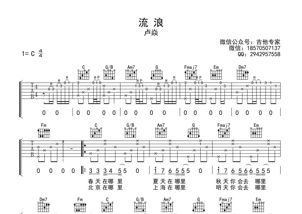 卢焱《流浪》吉他谱 - C调弹唱六线谱