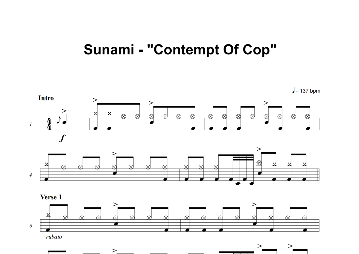 《Contempt Of Cop》是Sunami演唱的一首歌曲,这份架子鼓谱共有五张高清图谱,图谱由 @举个例子 编配上传,图谱使用五线谱编配,使用这份Contempt Of Cop架子鼓谱,你将能够轻松地敲打出这首Sunami的Contempt Of Cop,快来尝试吧。