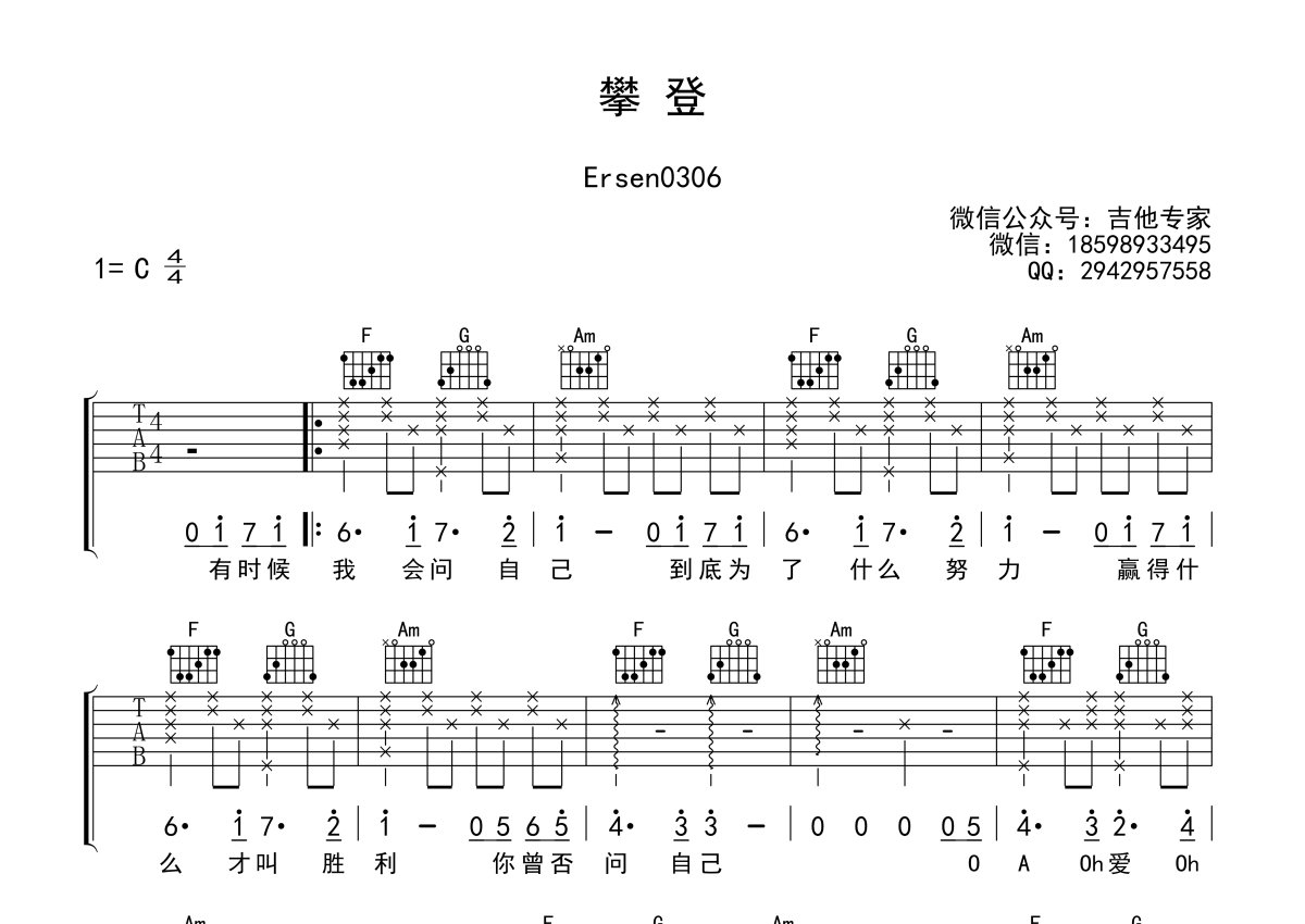 Ersen0306《攀登》吉他谱 - C调弹唱六线谱