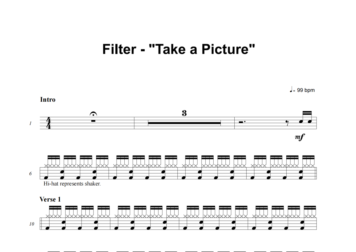 《Take A Picture》是Filter演唱的一首歌曲,这份架子鼓谱共有三张高清图谱,图谱由 @举个例子 编配上传,图谱使用五线谱编配,使用这份Take A Picture架子鼓谱,你将能够轻松地敲打出这首Filter的Take A Picture,快来尝试吧。