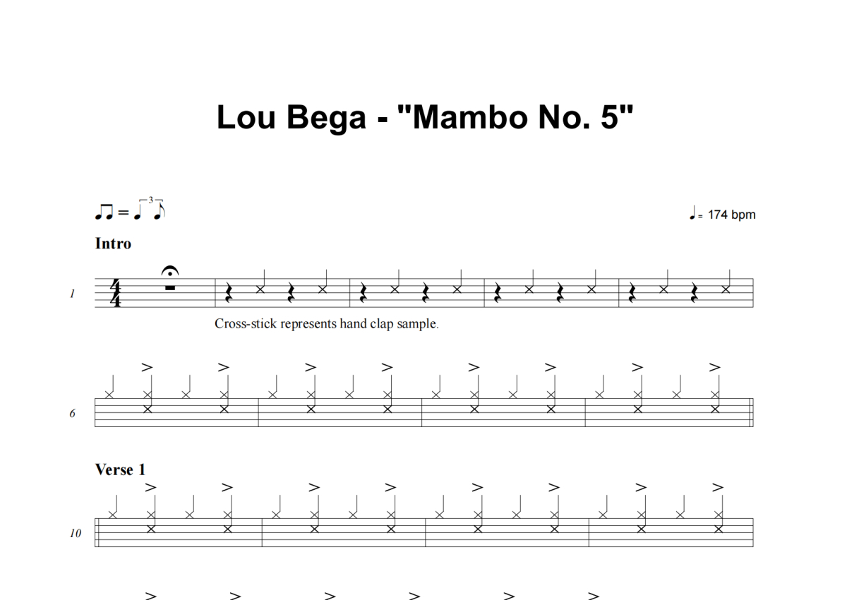 《Mambo No. 5》是Lou Bega演唱的一首歌曲,这份架子鼓谱共有五张高清图谱,图谱由 @举个例子 编配上传,图谱使用五线谱编配,使用这份Mambo No. 5架子鼓谱,你将能够轻松地敲打出这首Lou Bega的Mambo No. 5,快来尝试吧。