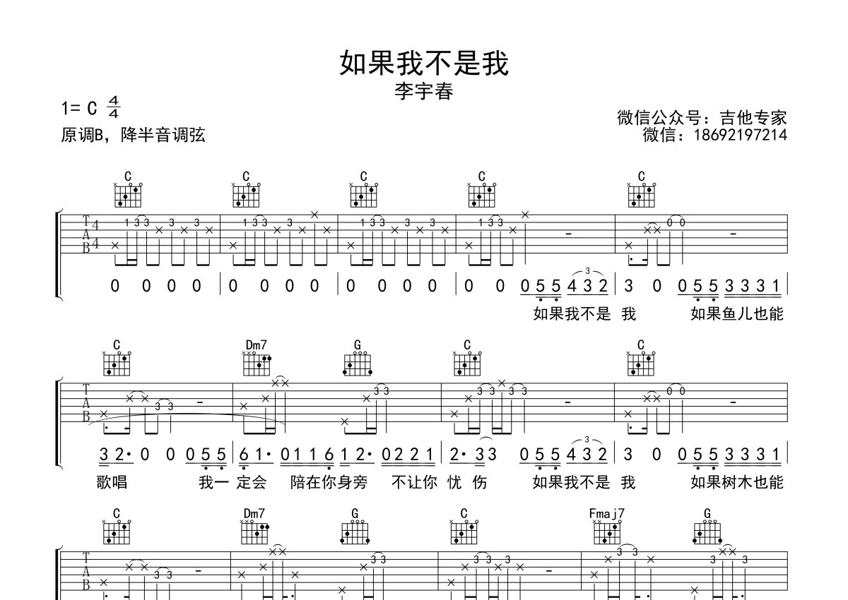 《如果我不是我》是李宇春演唱的一首歌曲,本吉他谱采用的是C调指法编配,这份吉他谱共有两张高清图谱,图谱由 @吉他专家 编配上传,图谱使用六线谱编配,包含吉他和弦指法、简谱以及歌词部分,使用这份如果我不是我吉他谱,可以让你更加方便地掌握这首歌曲的弹唱技巧,快来尝试吧。李宇春《如果我不是我》吉他谱_C调吉他弹唱谱。