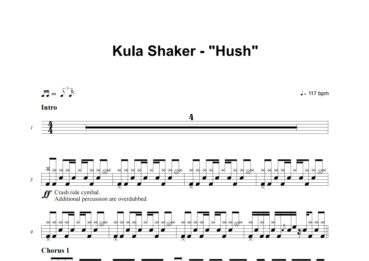 《Hush》是Kula Shaker演唱的一首歌曲,这份架子鼓谱共有三张高清图谱,图谱由 @举个例子 编配上传,图谱使用五线谱编配,使用这份Hush架子鼓谱,你将能够轻松地敲打出这首Kula Shaker的Hush,快来尝试吧。